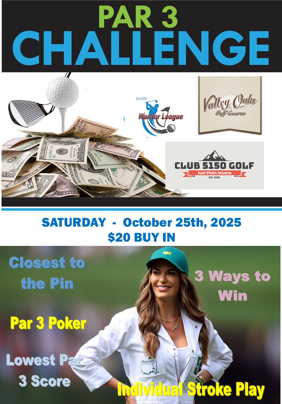 Winter League Registration The Par 3 Challenge at Valley Oaks Registration Please enable JavaScript in your browser to complete this form.Please click box below and type in your name if you intend to play.Yes – I will be playing in the 5150 Winter League Par 3 Challenge Tournament at the Valley Oaks Golf Club, on October 25th, 2025.Name *FirstLastCommentSubmit